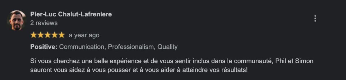 "Avec le service de nutrition, j’ai réussi à perdre un peu de poids, mais surtout de la masse grasse puisque j’ai prit du muscle grâce au programme! La différence dans leur service VS le faire toi-même, c’est le fait d’avoir un suivi et de devoir quelque chose à quelqu’un.""Avec le service de nutrition, j’ai réussi à perdre un peu de poids, mais surtout de la masse grasse puisque j’ai prit du muscle grâce au programme! La différence dans leur service VS le faire toi-même, c’est le fait d’avoir un suivi et de devoir quelque chose à quelqu’un.