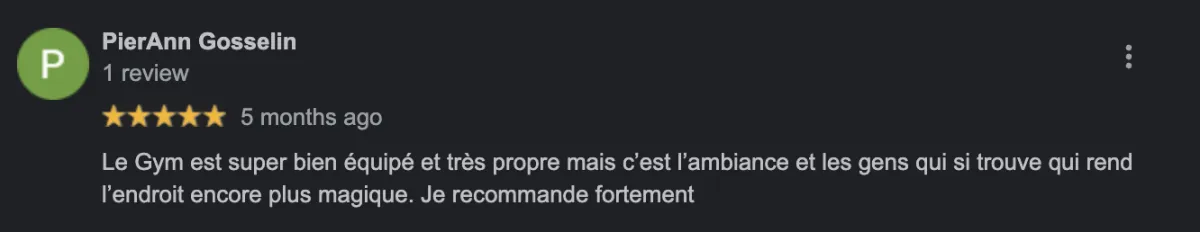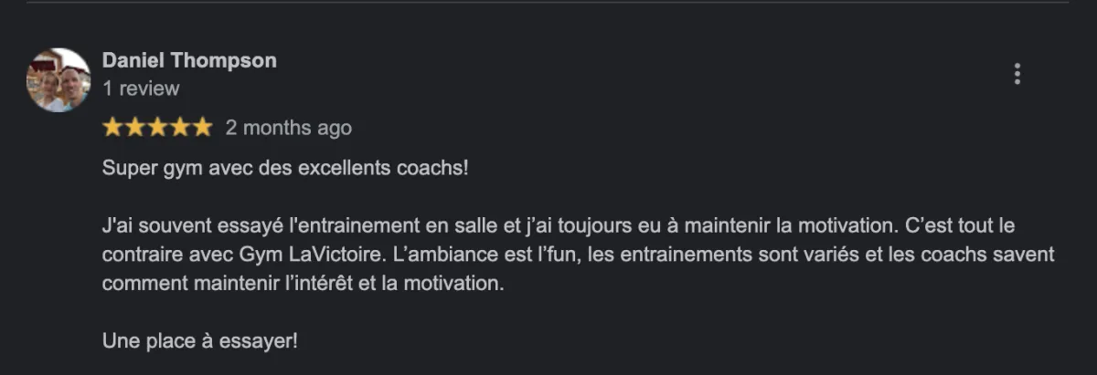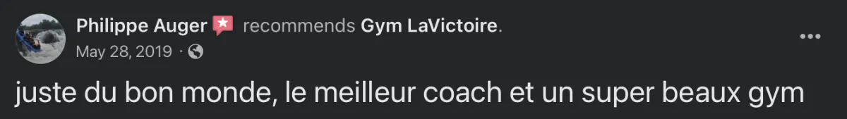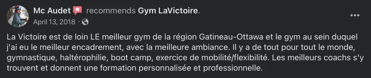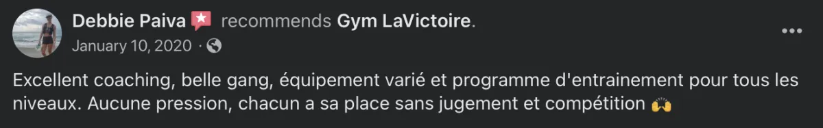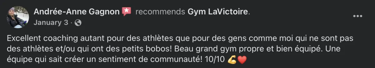"Ça fait maintenant un an que je suis avec le Gym LaVictoire et j’ai aussi profité du suivi alimentaire. Il n’y a rien de magique, dès que je me suis mise à écouter les coach avec leurs conseils, mes performances ont beaucoup augmenté! J’ai perdu plus de 15lbs, gagné de la masse musculaire, augmenté mes poids dans tous les exercices, amélioré mon cardio et je dors mieux.